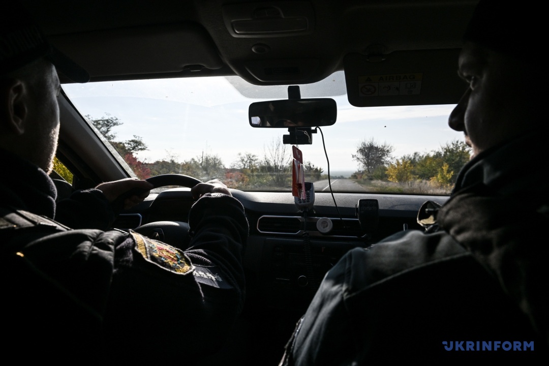 Pojechaliśmy do Małokateryniwki w towarzystwie policjantów z gminy. Aby chronić siebie i nas, zabierają ze sobą „cukierka” – urządzenie, które „widzi” drony z daleka i ostrzega przed nimi. Przed wyjazdem stróże prawa ostrzegają, że musimy być gotowi do szybkiego wyskoczenia z samochodu i ucieczki do choćby najprostszej kryjówki. Jedziemy z otwartymi oknami – nasłuchujemy nieba, a i „cukierek” też je obserwuje.