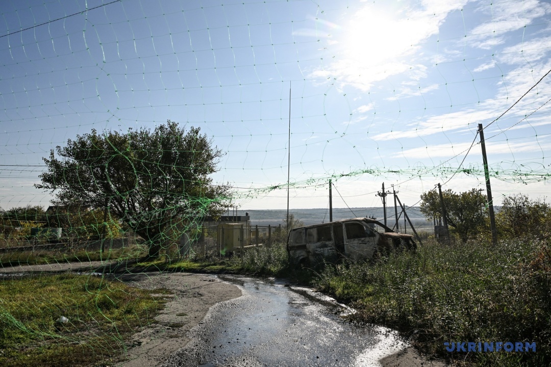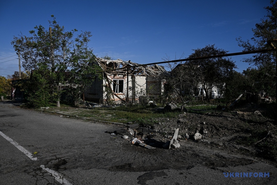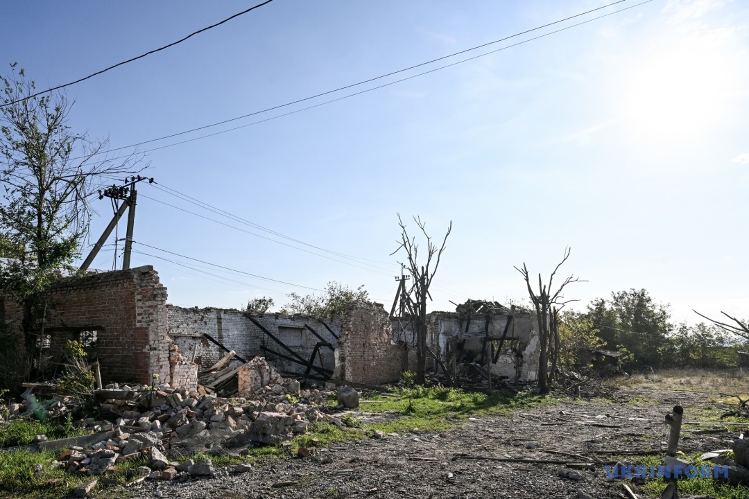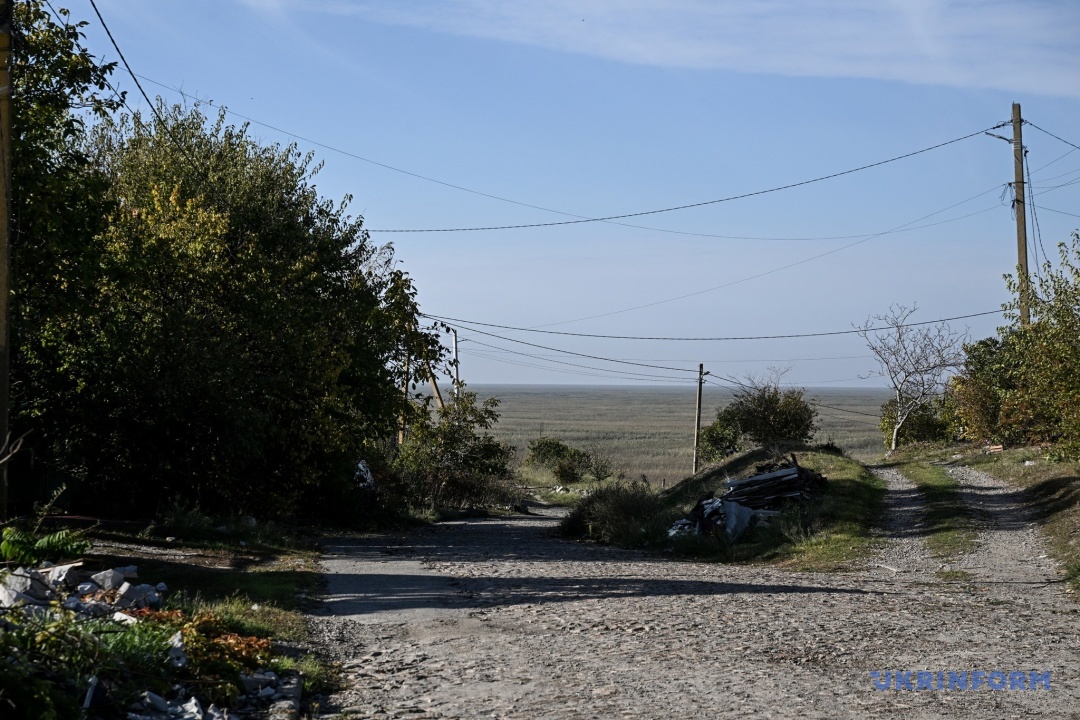 „No więc zaczyna się Małokateryniwka. Stąd do frontu jest 5 kilometrów. Wróg próbuje też wejść od strony dawnego zbiornika, zapuszcza swoje DRG. Codziennie atakuje dronami, uderza z KAB-ów. Ostatnio w ciągu dwóch dni przyleciało 16 KAB-ów, dolatują MLRS. Około 40-50% domów we wsi zostało zniszczonych, a 80% uszkodzonych” – mówi po drodze policjant z gminy Serhij Wołyk.