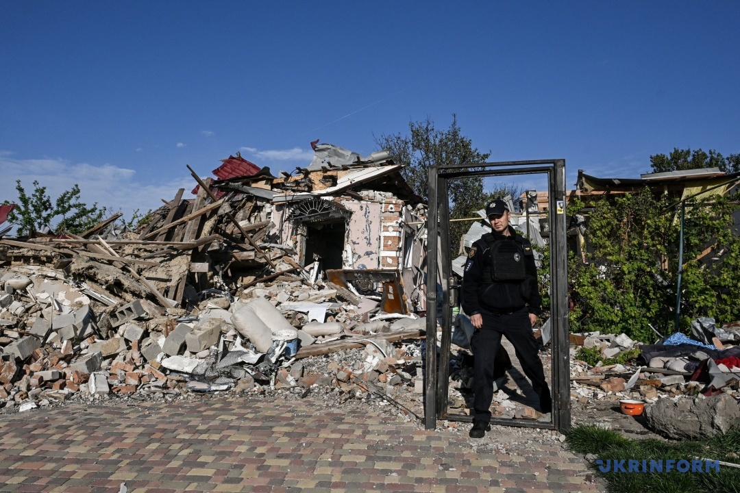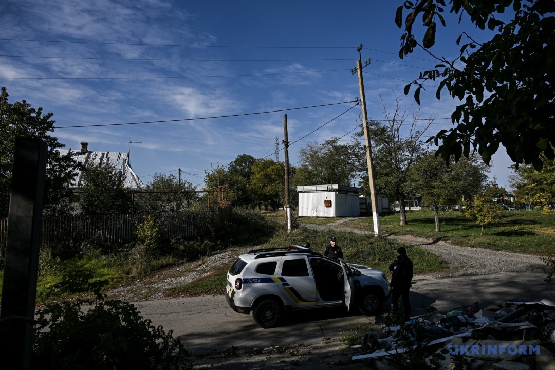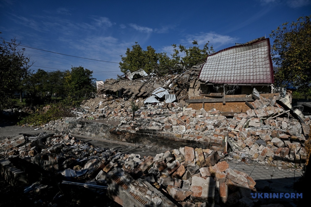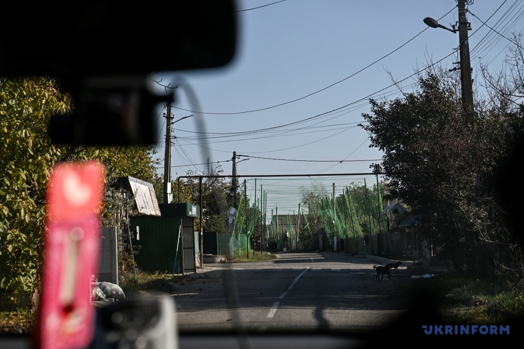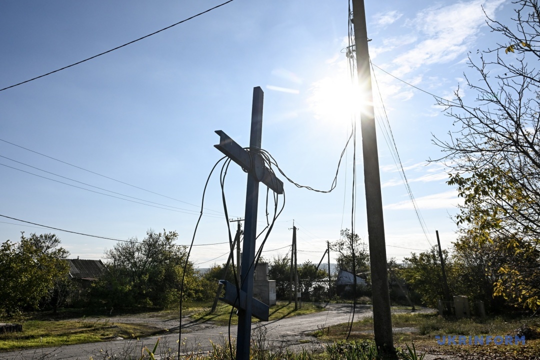 „No więc zaczyna się Małokateryniwka. Stąd do frontu jest 5 kilometrów. Wróg próbuje też wejść od strony dawnego zbiornika, zapuszcza swoje DRG. Codziennie atakuje dronami, uderza z KAB-ów. Ostatnio w ciągu dwóch dni przyleciało 16 KAB-ów, dolatują MLRS. Około 40-50% domów we wsi zostało zniszczonych, a 80% uszkodzonych” – mówi po drodze policjant z gminy Serhij Wołyk.