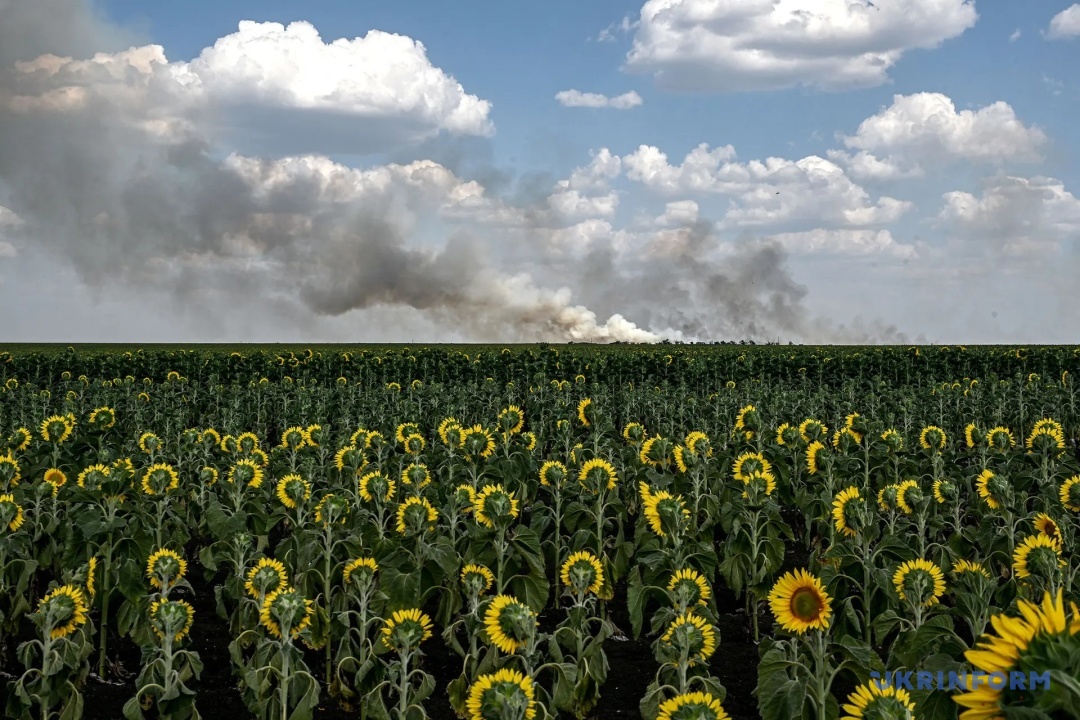 Zdjęcie ze Smoleńska przedstawia dym unoszący się po rosyjskim ostrzale pola słoneczników w obwodzie zaporoskim 8 lipca.