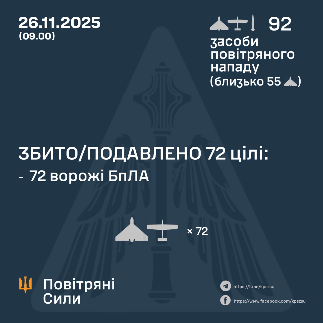 Według wstępnych danych, o godz. 9:00 w środę 26 listopada obrona przeciwlotnicza zestrzeliła/uniemożliwiła zestrzelenie 72 bezzałogowych statków powietrznych na północy, południu i wschodzie Ukrainy.