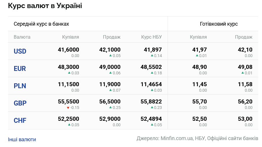 w monobanku: 41,72 - 42,17 UAH/$ i 48,35 - 49,00 UAH/EUR.