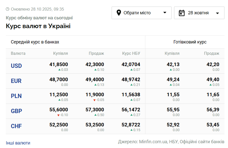 w monobanku: 41,80 - 42,19 UAH/$ i 48,60 - 49,26 UAH/EUR.