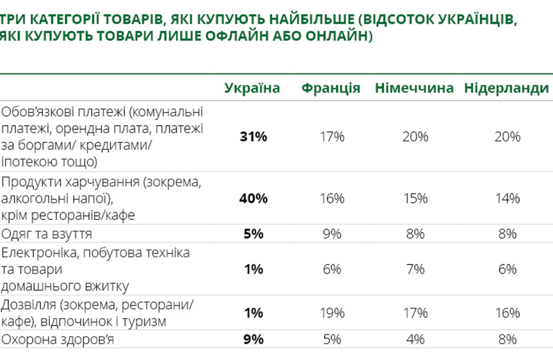 Jak zauważa Deloitte Ukraine, w przeciwieństwie do mieszkańców krajów europejskich, Ukraińcy przeznaczają zazwyczaj 84% swojego miesięcznego budżetu na podstawowe dobra i usługi, podczas gdy mieszkańcy Niemiec i Holandii wydają 56-59%.