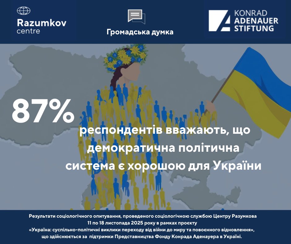 Według niego przeważa odsetek osób przekonanych, że demokratyczny system polityczny jest dobry dla Ukrainy – w 2017 r. odsetek ten wyniósł 86,5%, a w listopadzie 2025 r. – 87%.