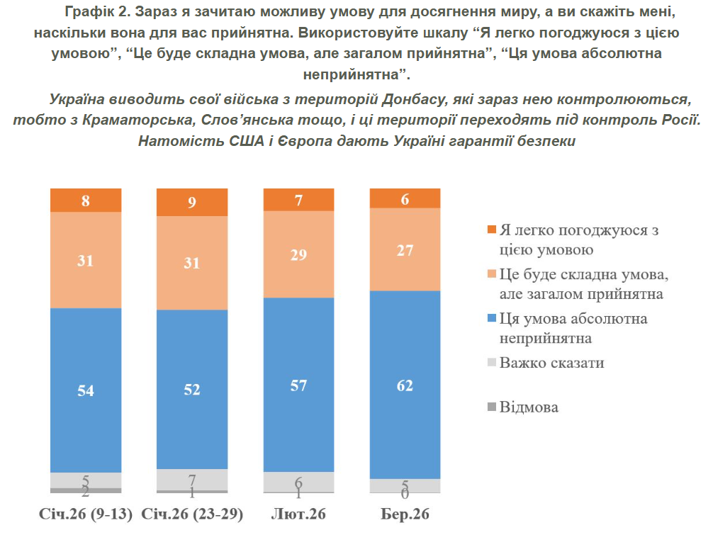 62% respondentów uważa za absolutnie niedopuszczalne oddanie całego Donbasu pod kontrolę Rosji w zamian za gwarancje bezpieczeństwa. 33% jest gotowych na takie ustępstwo, ale większość przyznaje, że warunek ten jest nadal trudny do spełnienia. Pozostali respondenci nie potrafili się zdecydować.