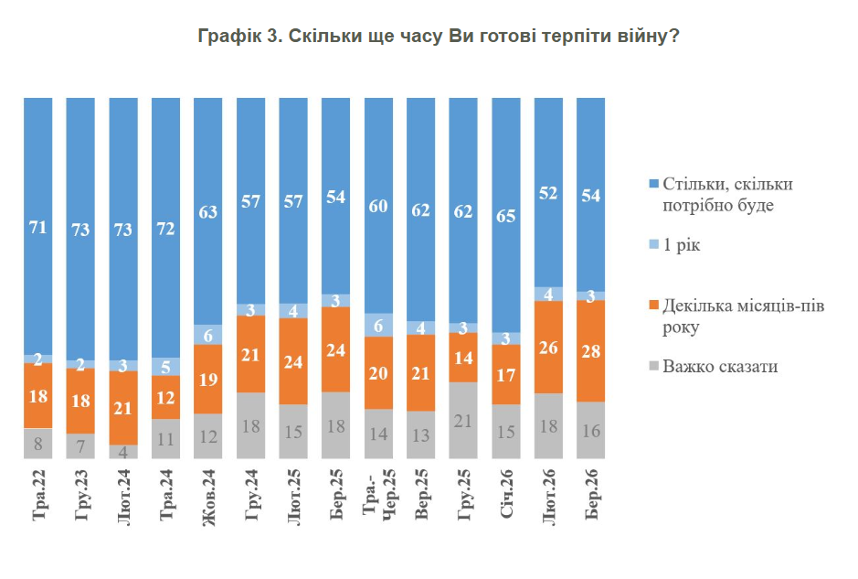 Marcowy sondaż pokazuje, że 54% Ukraińców jest gotowych znosić wojnę tak długo, jak będzie to konieczne. 28% obywateli deklaruje krótszy okres – do sześciu miesięcy. Dla porównania: pod koniec stycznia 65% było gotowych znosić wojnę bezterminowo, a w połowie lutego – 52%.
